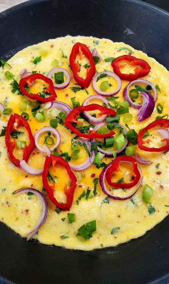 - Parsemez l’omelette avec l’oignon et le poivron rouge finement découpés, ainsi que le reste du persil et de l’oignon vert.