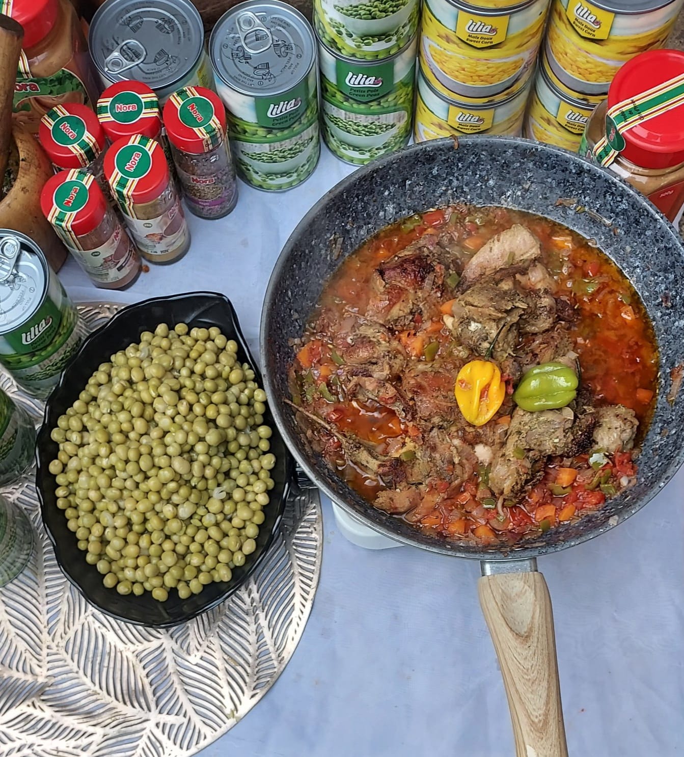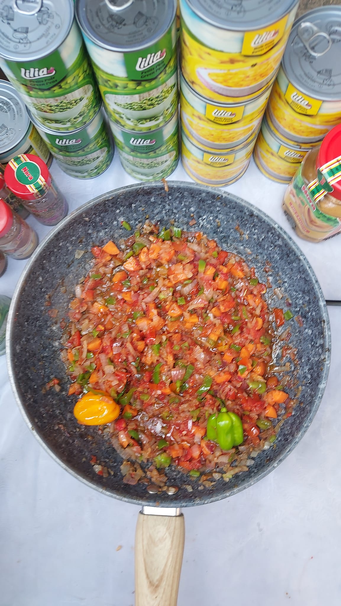 - Dans la même poêle, ajoutez les oignons émincés, les tomates coupées en dés, les poivrons tranchés et le concentré de tomate. Faites revenir le tout pendant quelques minutes jusqu’à ce que les légumes soient tendres.