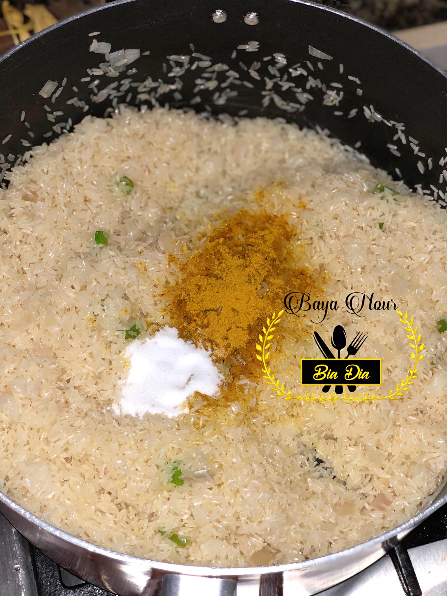 - Ajoutez le riz, le curry ou les épices indiennes, et le sel. Mélangez bien pour enrober le riz des épices.