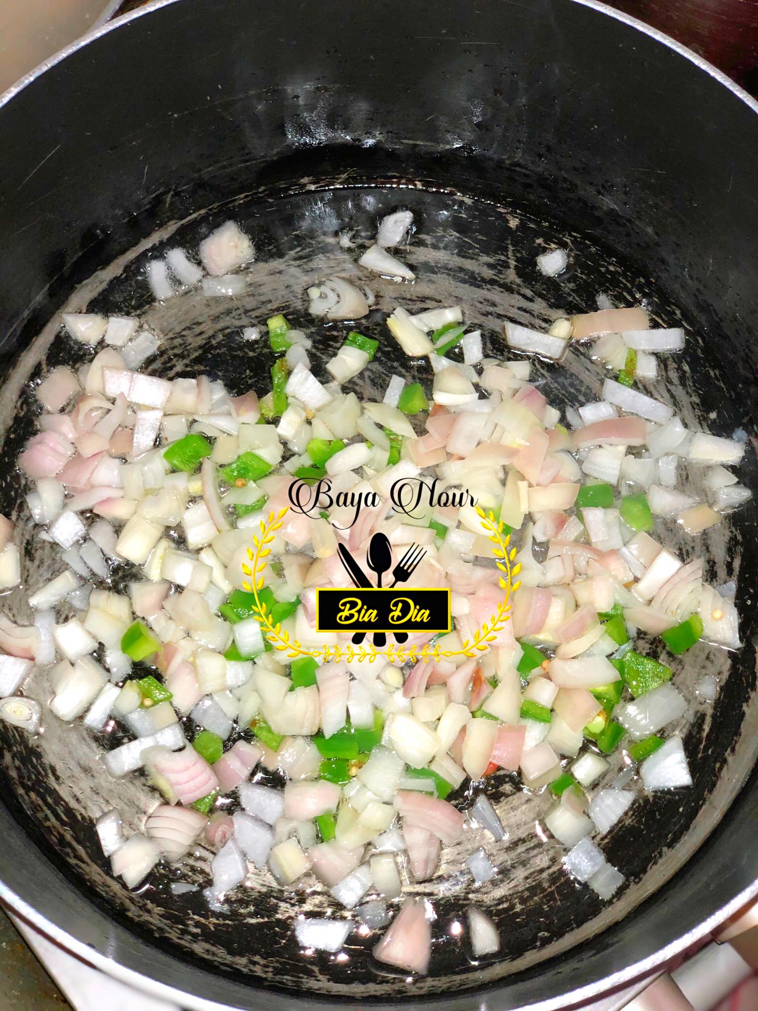 - Dans une cocotte ou une marmite, faites revenir les oignons et les poivrons dans de l’huile chaude.