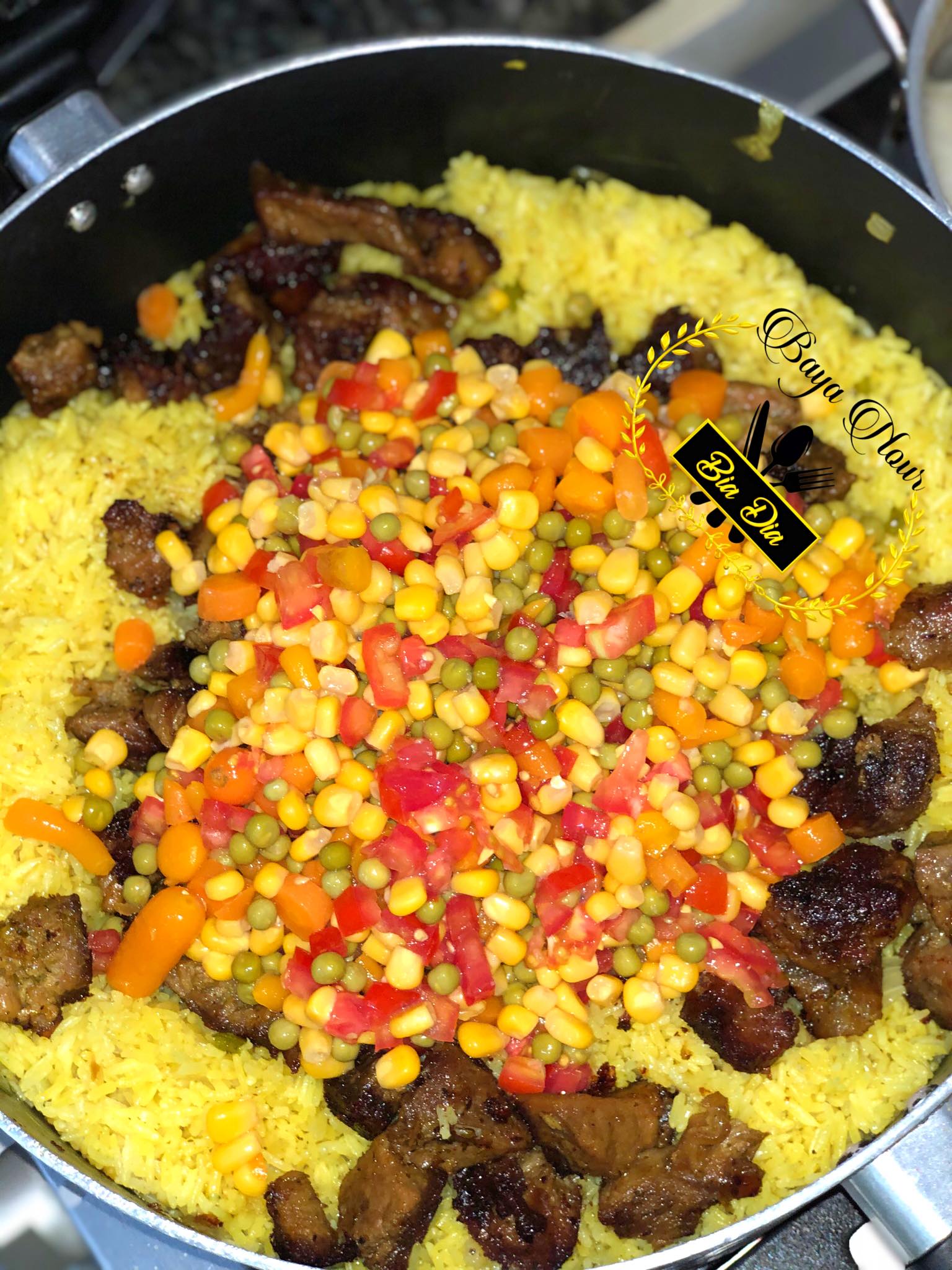- Lorsque le riz est cuit, incorporez le maïs, les tomates, les carottes, les petits pois et les morceaux de viande frits.