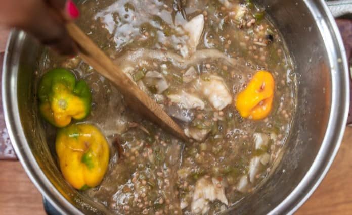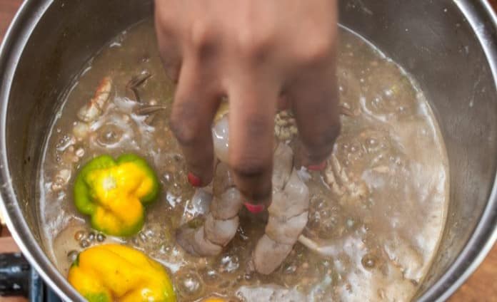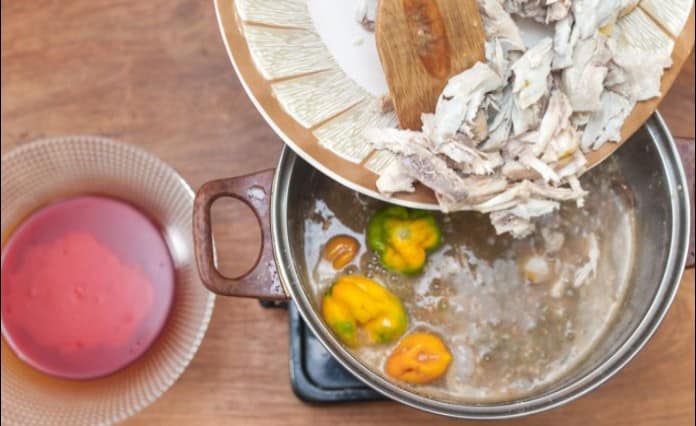- Ajoutez le poisson, les crabes nettoyés et ouverts, le yét, le guedji et les diakhatous. Laissez cuire pendant 20 minutes.