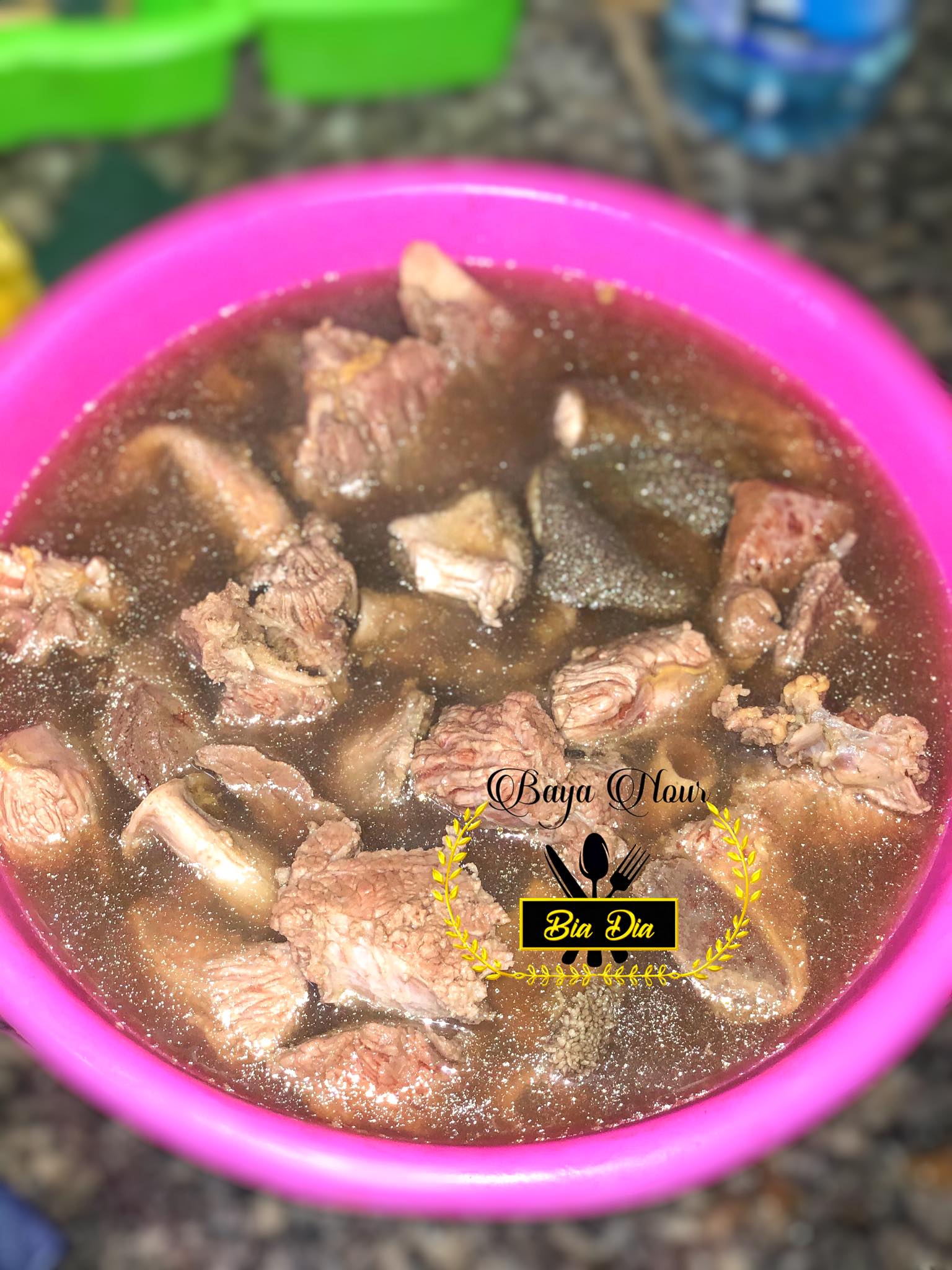 - Placez les morceaux de viande dans un grand bol ou une bassine. Versez l’eau bouillante sur la viande, assurez-vous qu’elle est entièrement immergée, et laissez reposer pendant 5 minutes. Cette étape aide à nettoyer et attendrir la viande.