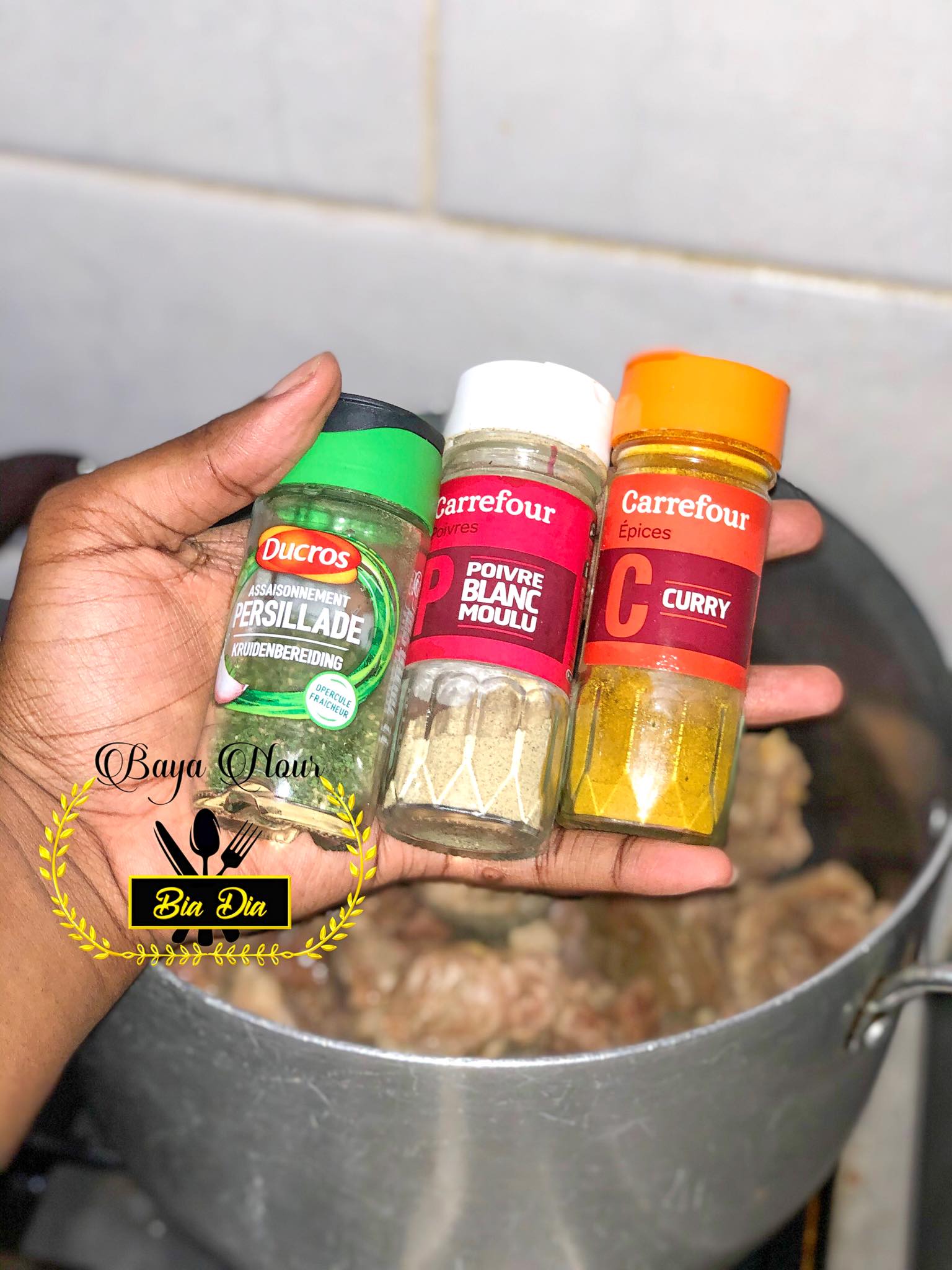- Incorporez les oignons émincés, l’ail écrasé, la persillade, le poivre blanc, le curry et le sel.