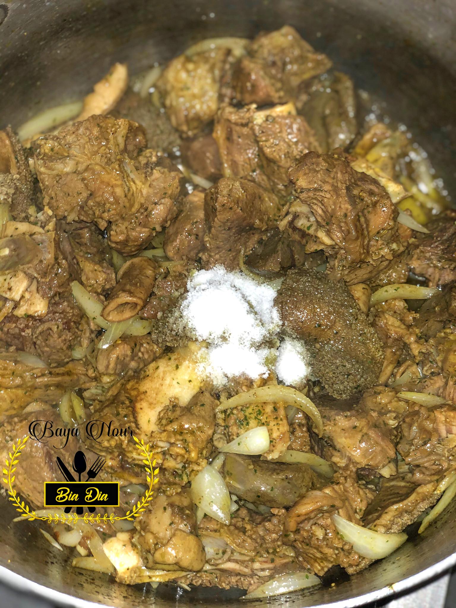 - Remuez bien pour enrober la viande des épices et des aromates, et laissez cuire pendant quelques minutes jusqu’à ce que les oignons soient translucides.
