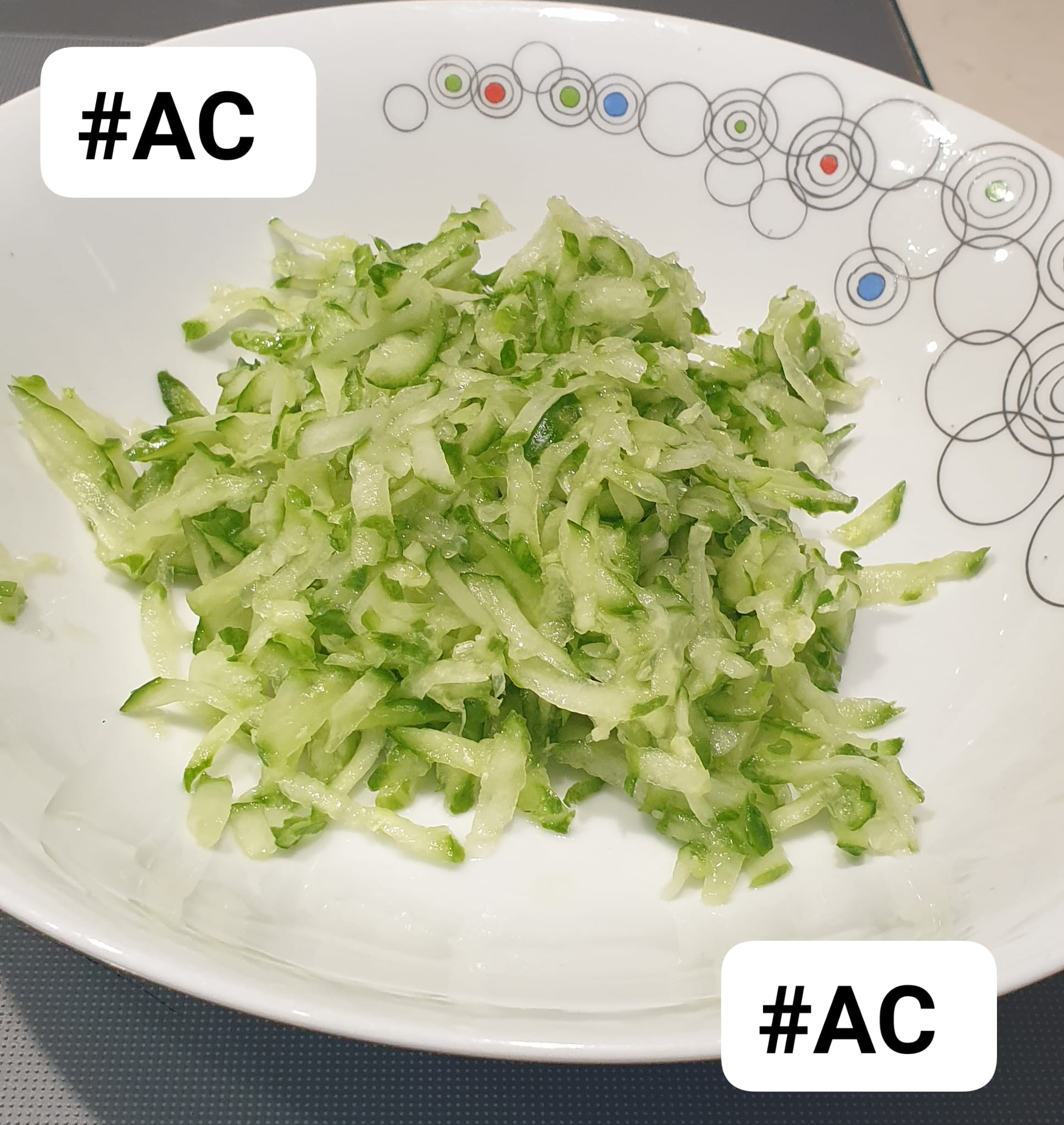 • Râpez grossièrement le concombre et égouttez l’excès d’eau.