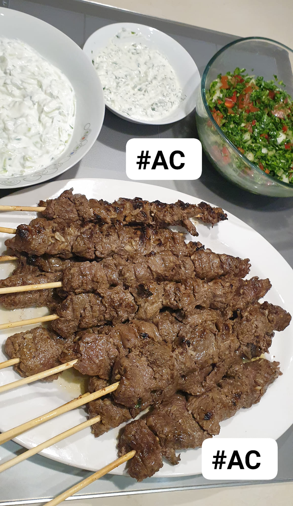 Brochettes de bœuf marinées et leurs accompagnements frais