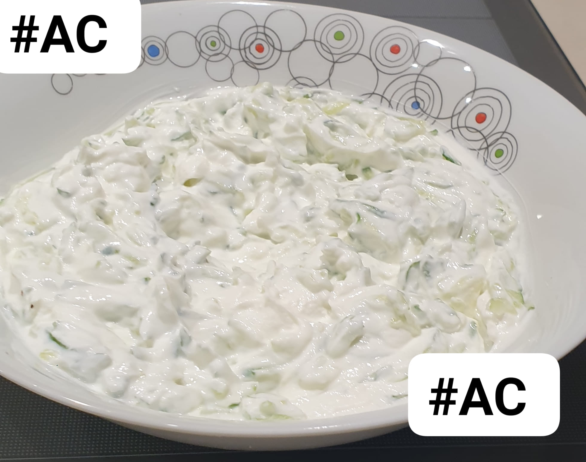 • Mélangez le concombre râpé avec le yaourt nature et une pincée de sel.​