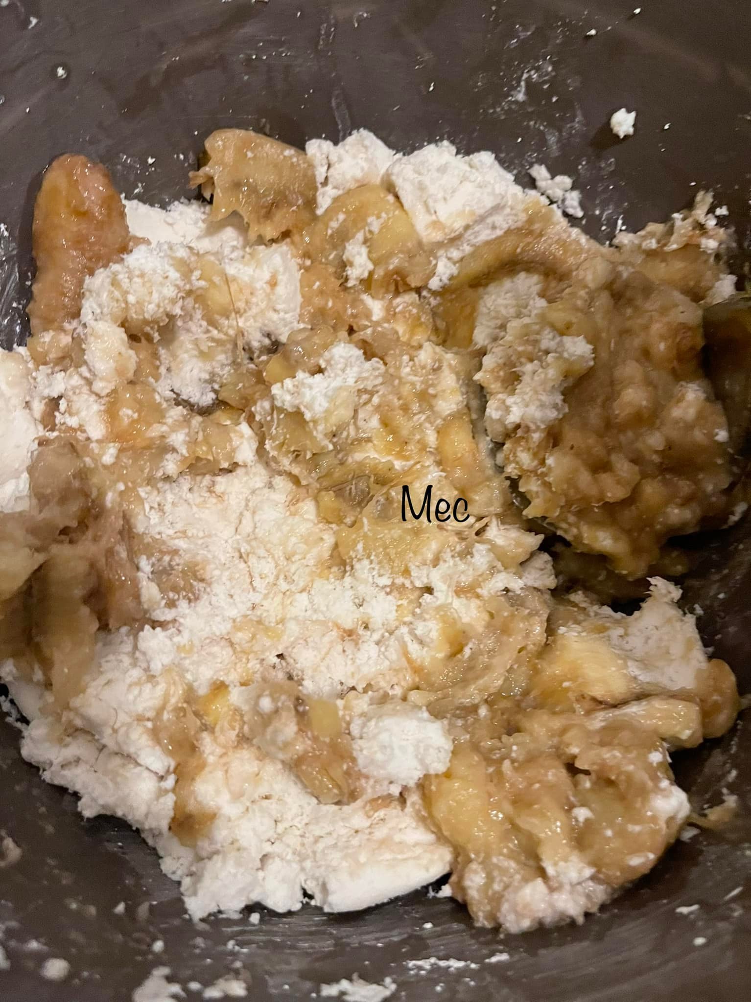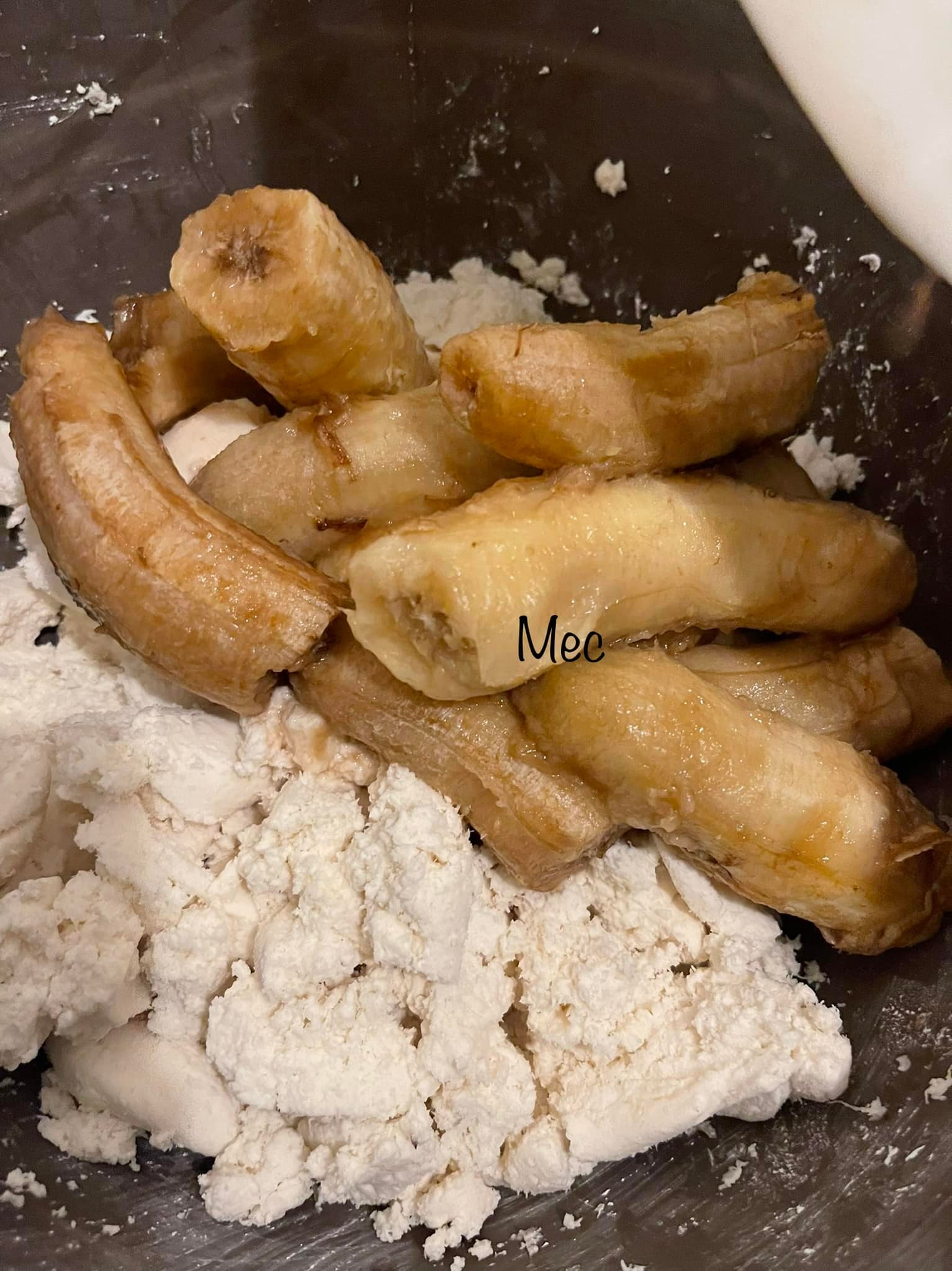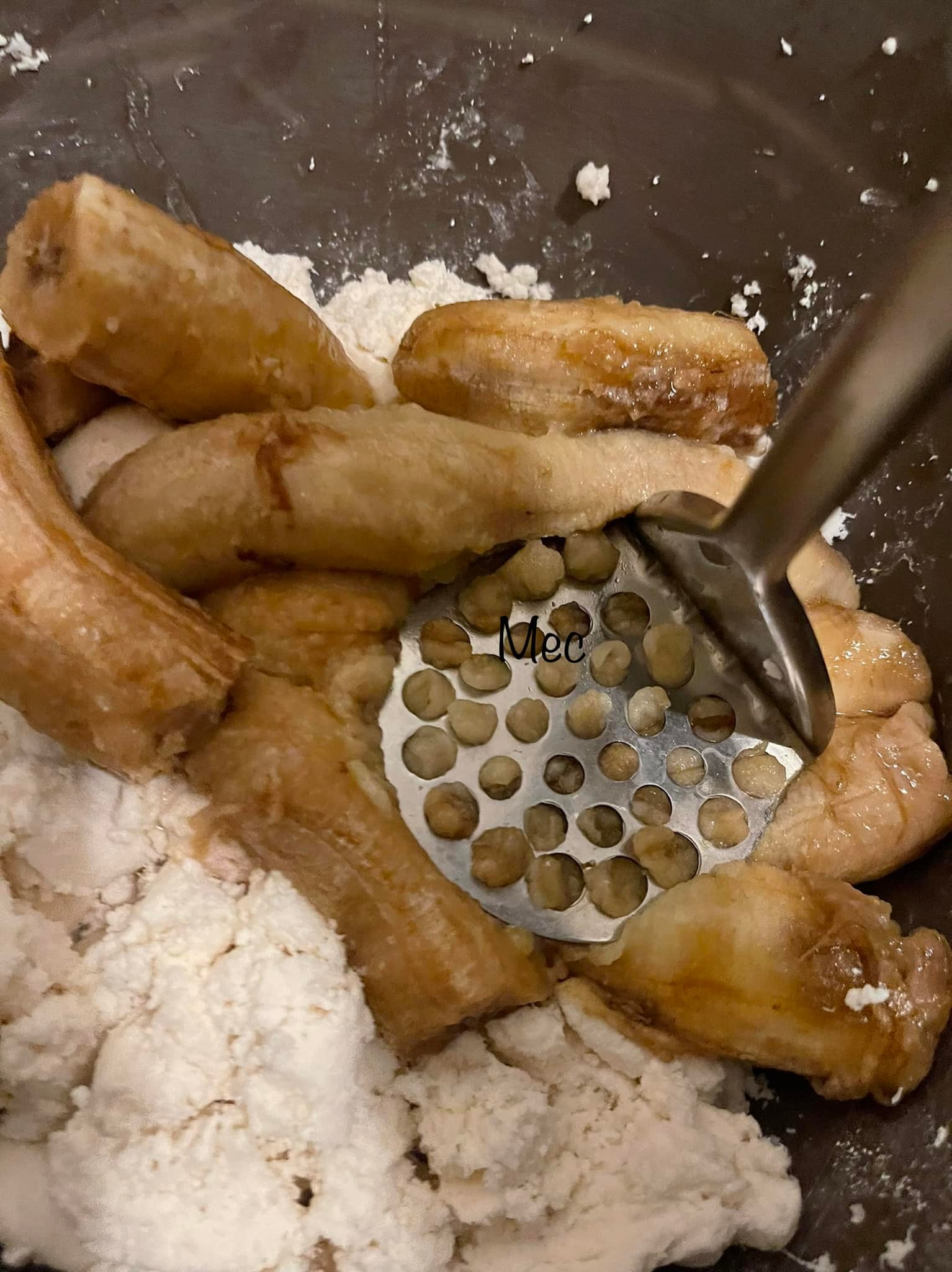- Écrasez les bananes mûres et mélangez-les au manioc râpé.