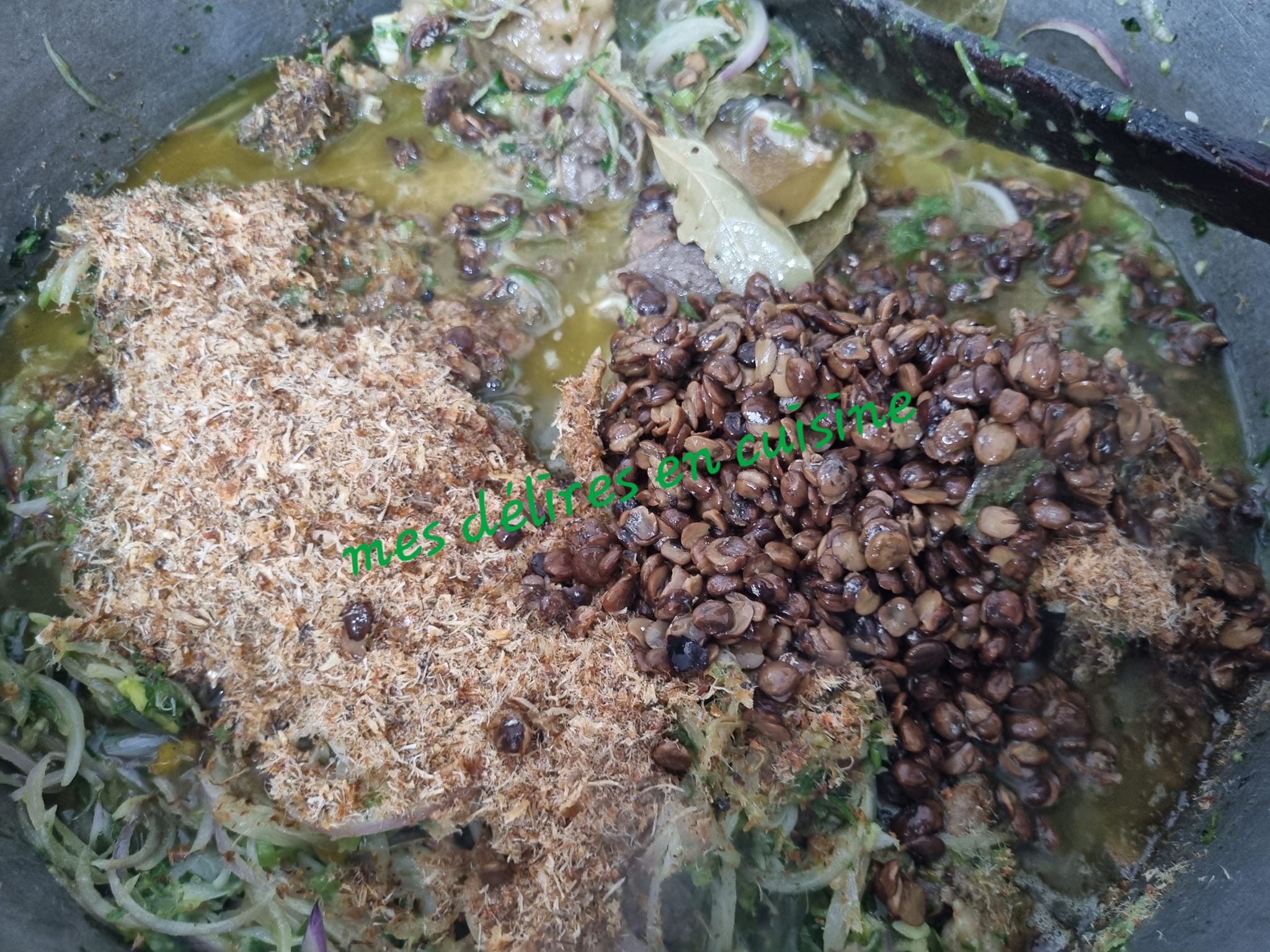 - Assaisonnez avec le soumara, la poudre de crevettes, le poivre blanc et le sel.