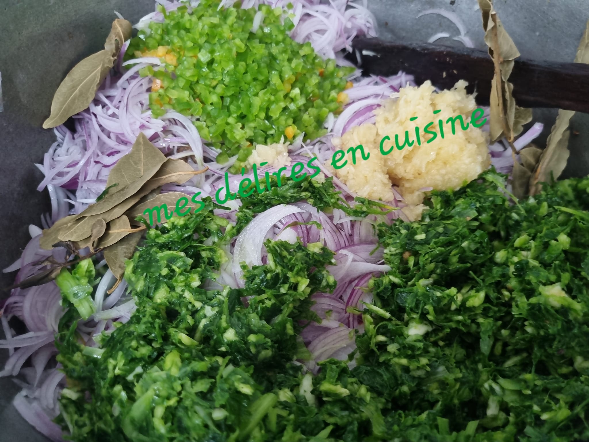- Ajoutez l’ail écrasé, les feuilles d’oignons, le persil et le gingembre pilés. Mélangez bien.