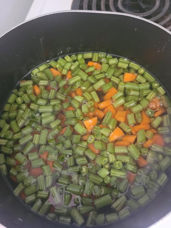 - Découpez les carottes en dés et les haricots verts en morceaux.