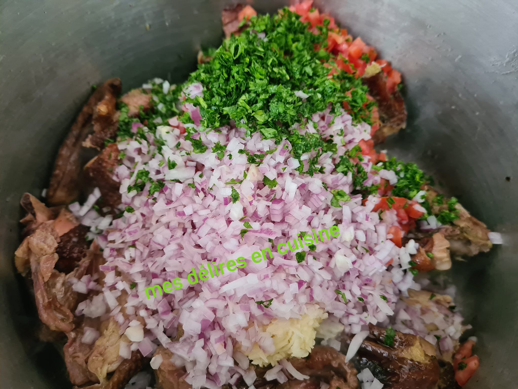 Incorporez les tomates et les oignons découpés. Mélangez bien et laissez mijoter à feu doux pour que les saveurs se développent.