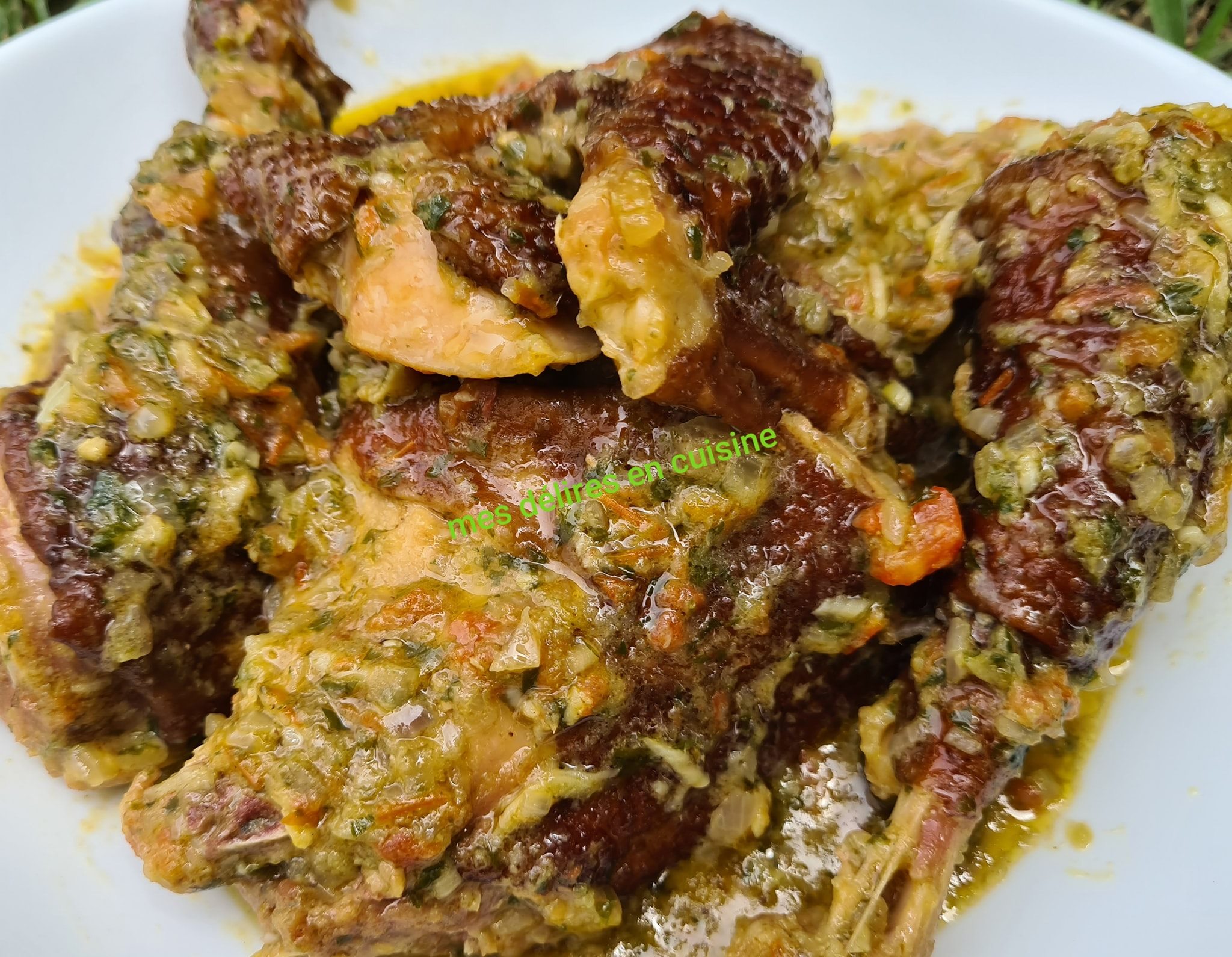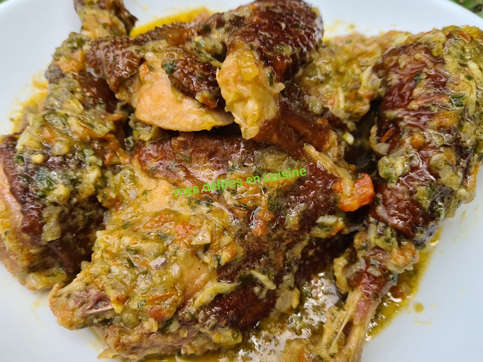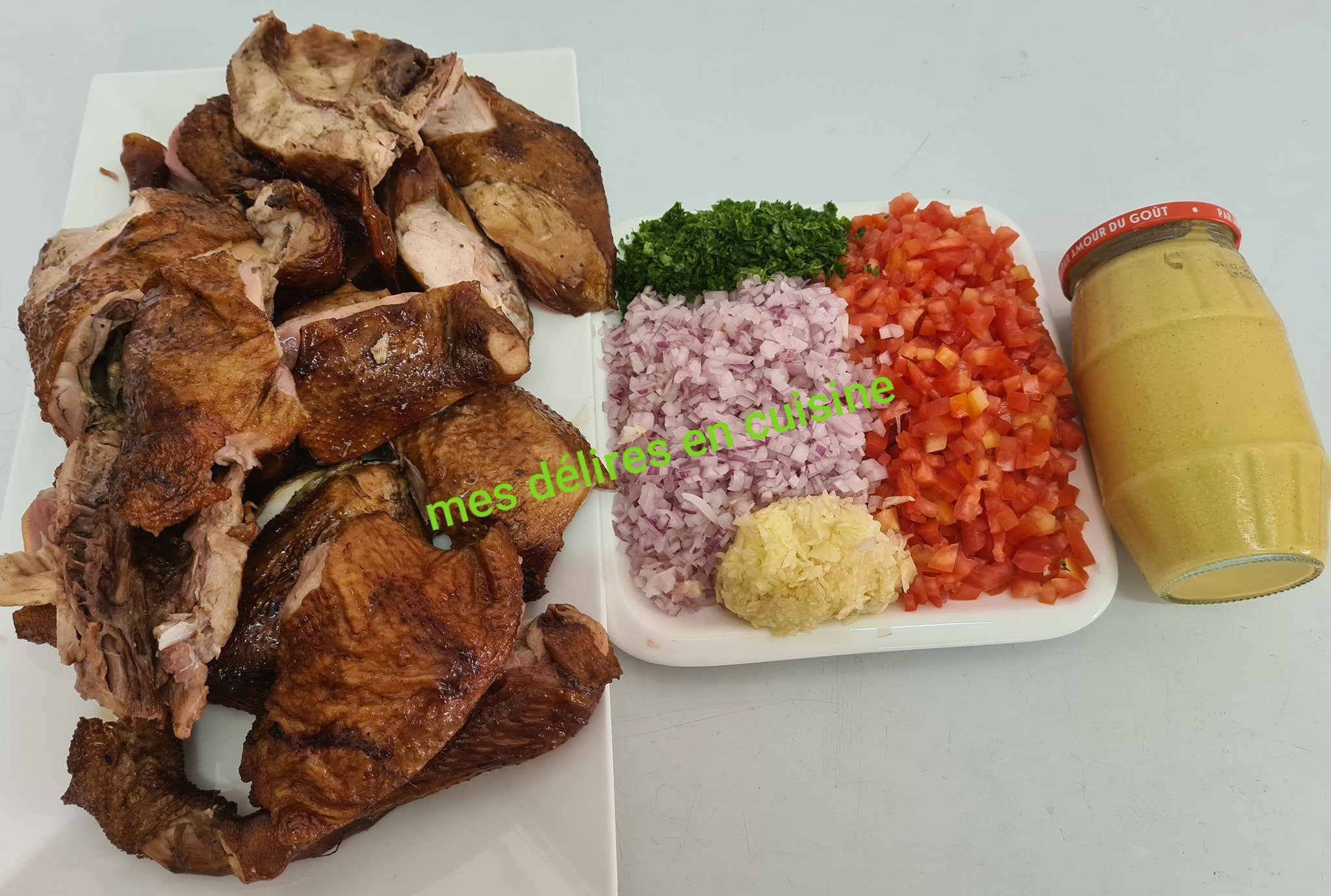 Servez ce délicieux poulet fumé à la moutarde accompagné de riz blanc, de bananes plantains frites ou de légumes vapeur pour un repas complet et savoureux.