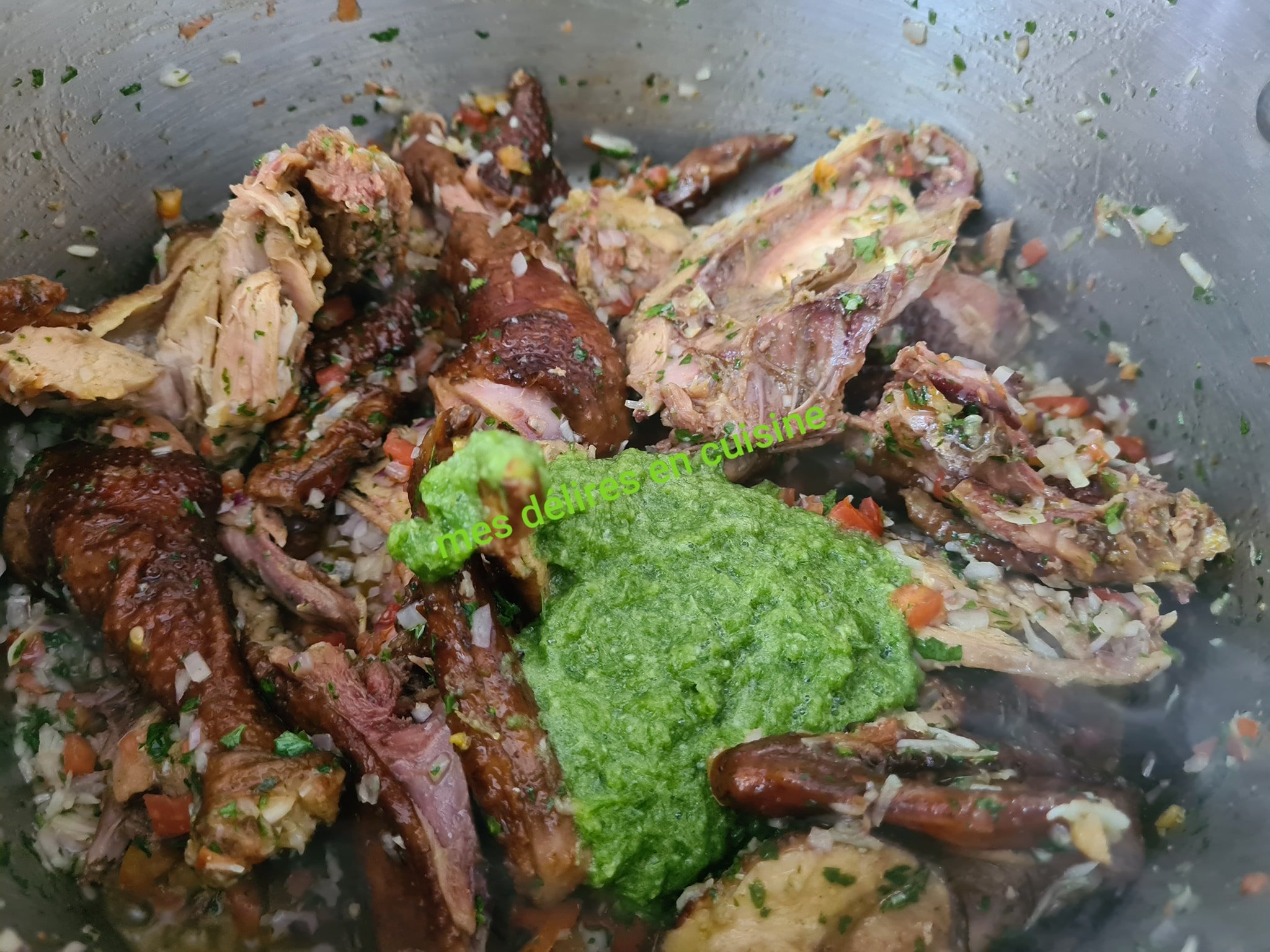 Dans une marmite, faites bouillir le poulet fumé avec une partie du mélange ail-poireau écrasé. Salez, poivrez et laissez cuire jusqu’à ce que le poulet soit bien tendre.