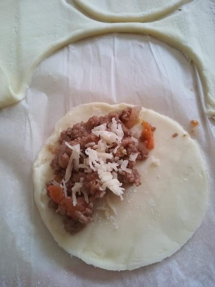- Sur chaque cercle, déposez une cuillère à soupe de farce et un peu de fromage râpé si désiré.