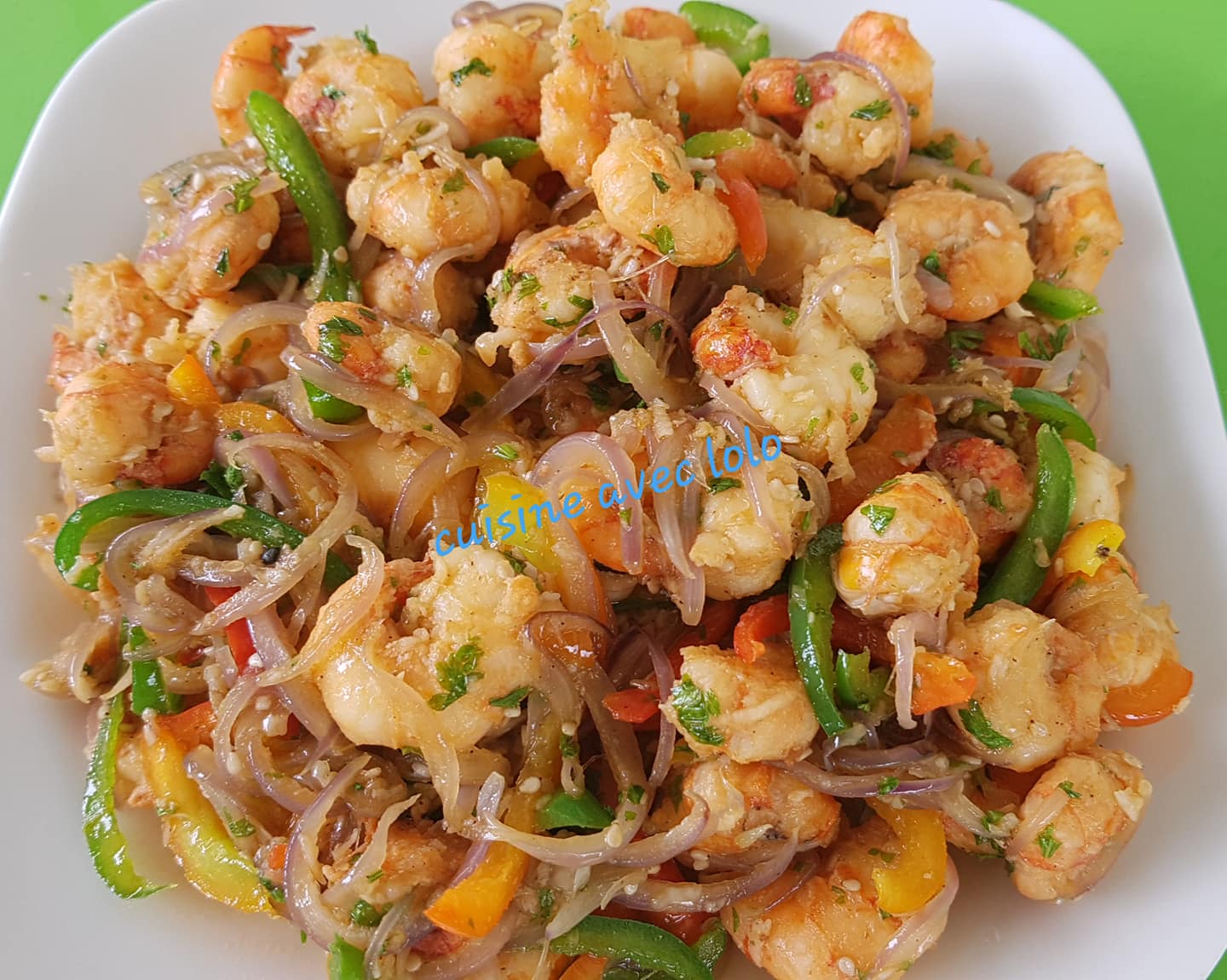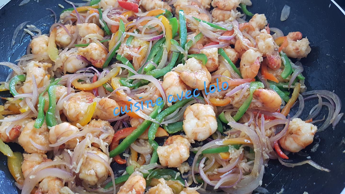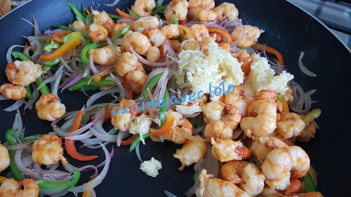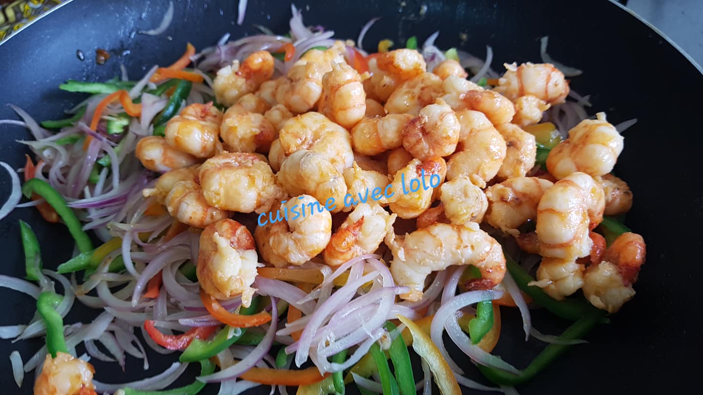 - Remettez les crevettes dans la poêle avec les légumes.