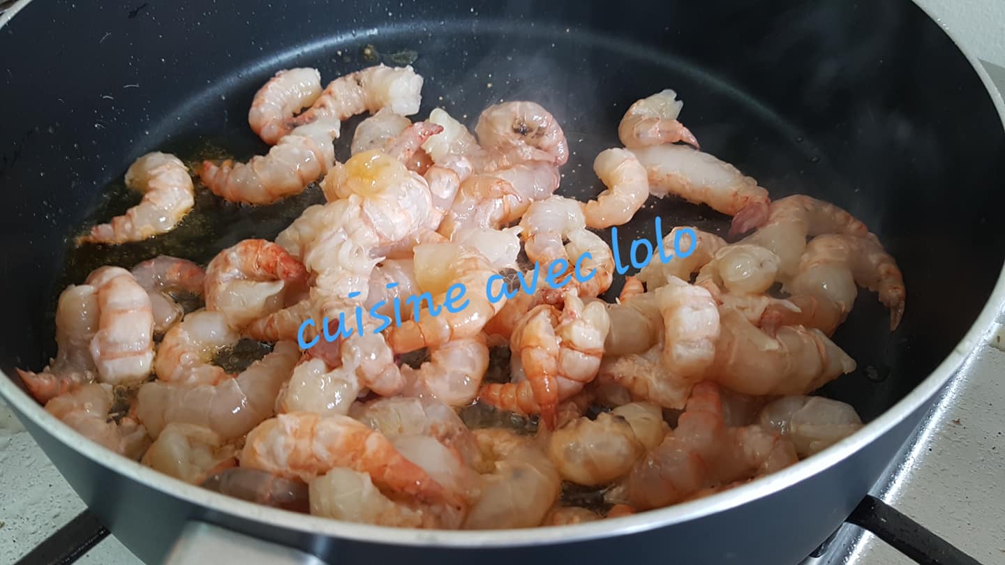 - Ajoutez les crevettes et faites-les revenir pendant 5 minutes jusqu’à ce qu’elles deviennent roses et légèrement dorées.