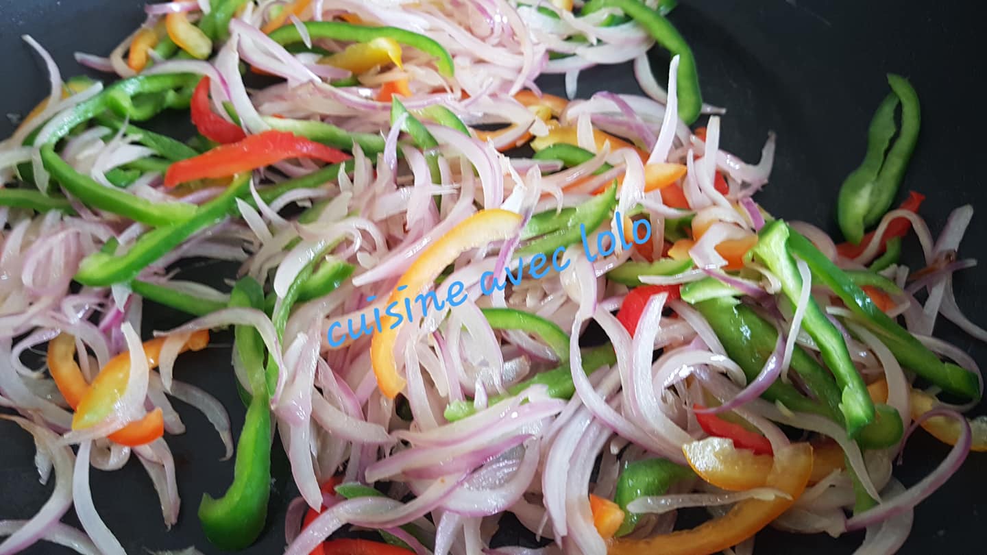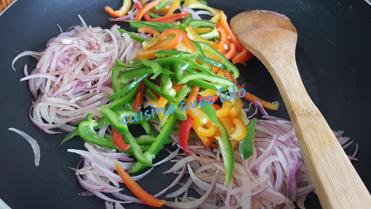 - Incorporez les poivrons rouges et verts émincés aux oignons.